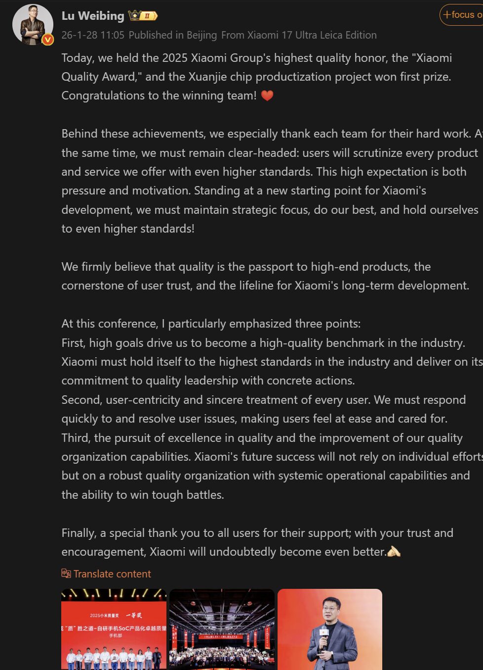 En el anuncio de que el proyecto del chip XRING había ganado el premio a la calidad, Lu Weibing fue tajante sobre la situación en la que se encuentra el gigante tecnológico. Dijo que las expectativas del usuario son más altas que nunca. Calificó la calidad de «salvavidas» para el desarrollo de Xiaomi. También esbozó tres puntos importantes para el desarrollo de la empresa en el futuro. Los tres puntos son los siguientes